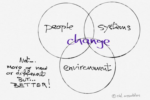 Change, of course, can be challenging, awkward and divisive, and there’s the old cliche about people liking the idea of change as long as they don’t have to change themselves. But change isn’t just about people. For genuine, effective, sustainable change to happen, three things need to be addressed simultaneously: People, Systems and Environment. Changing one or even two of those will lead to whatever change is envisaged either not working as well it could or not at all.