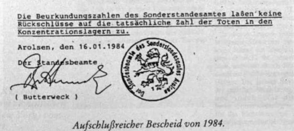 What is clear is that the document the Holocaust deniers are using to produce that figure of c. 280,000 provides information on the number of Jewish prisoners murdered in a number of German concentration camps (not the main extermination camps) for whom death certificates were issued retrospectively by the Special Registry Office. The SRO is the only body authorized to issue death certificates for people who died under these circumstances and requires an application from victims’ next of kin….if they exist.
