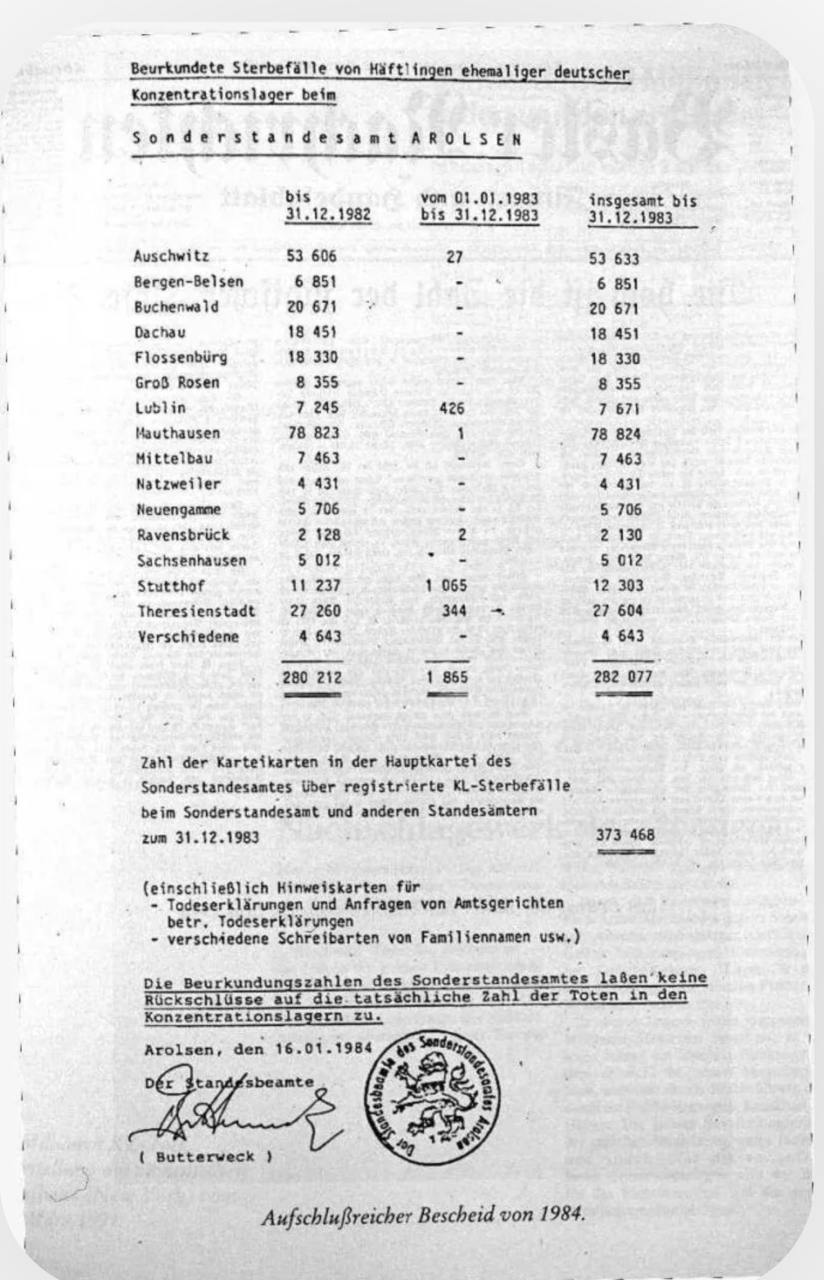 The figure of c. 280,000 refers specifically to a document dated 16 January 1984 issued by the Special Registry Office in Bad Arolsen, Germany which was set up in 1949 as the International Tracing Service. The organisation is now known as the Arolsen Archives and contains c. 40 million documents regarding victims of Nazi persecution.