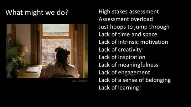 We need, somehow, to shift out of our familiar, engrooved discourses and practices and ask how and why students are assessed in the first place. We could also usefully ask why are students motivated to cheat or cut corners?