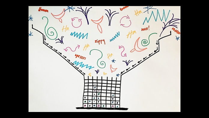 The individual who drew this said: “This is where I’m at regarding assessment. At its best, the work of my students is expansive! Multi-dimensional and multi-coloured. Dynamic and non-linear. This is how I sometimes feel when I come to quantify (assess) a student’s work – like I’m funnelling a wild and wonderful rainbow into a grid better suited to a game of noughts and crosses.”