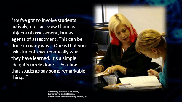 “You’ve got to involve students actively, not just view them as objects of assessment, but as agents of assessment. This can be done in many ways. One is that you ask students systematically what they have learned. It’s a simple idea; it’s rarely done…..You find that students say some remarkable things.”