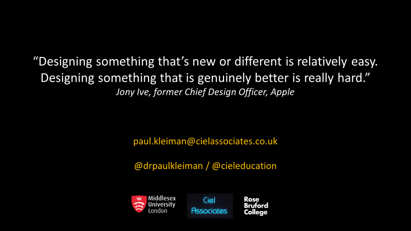 I trained and worked as a designer before stumbling into teaching, and one of the things one learns as a designer – often very painfully – is that there comes a point where it is futile trying to further change, adapt, tinker with an existing design. You’ve got to have to courage to scrap it and start again or, at the very least, undertake a fundamental re-design. Of course, for very understandable reasons, we are really bad at doing either of those things in higher education. Even if we had the will, we rarely, if ever, have the time or resources to engage in such an undertaking.