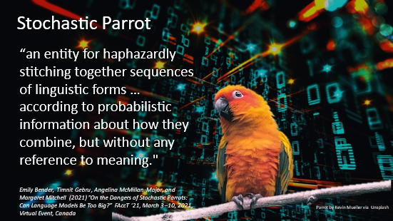 A stochastic parrot is an entity “for haphazardly stitching together sequences of linguistic forms … according to probabilistic information about how they combine, but without any reference to meaning.” The paper covered the risks of very large language models, regarding their environmental and financial costs, their inscrutability leading to unknown dangerous biases, the inability of the models to understand the concepts underlying what they learn, and the potential for using them to deceive people. The paper, controversially, resulted in Gebru and Mitchell losing their jobs at Google….but that’s a story for another day. Though the parrot may appear later.
