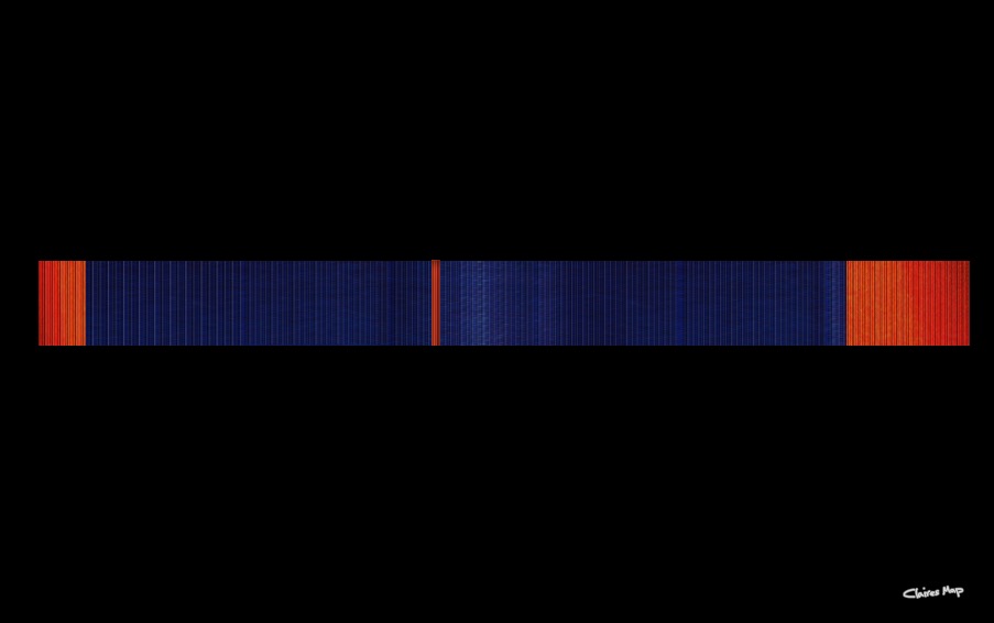 C. had attached a very large, rectangle of black card on the wall. It was in landscape format and across the middle, horizontally, ran a c.4cm strip of paper which was covered in dozens of identical, narrow vertical stripes of red, orange, light blue and dark blue. It looked like a beautiful spectrogram. In the bottom right hand corner was written ‘C’s map’. I remember staring at this with a colleague and wondering what did this map represent. Eventually, we called C. over and asked her to explain. It turned out that she lived about 2 miles from LIPA and it was a very cold day when she started making the map. What she had done was to walk from her warm bedroom, through the cold streets to LIPA taking a temperature reading every 20m or so. The different colours represented different temperatures. Red/Orange = warm, Light Blue/Dark Blue=cool/cold. When we asked what the warm strip right in the centre was, C. answered that her measured steps had taken to her to a hot air outlet of a shop.