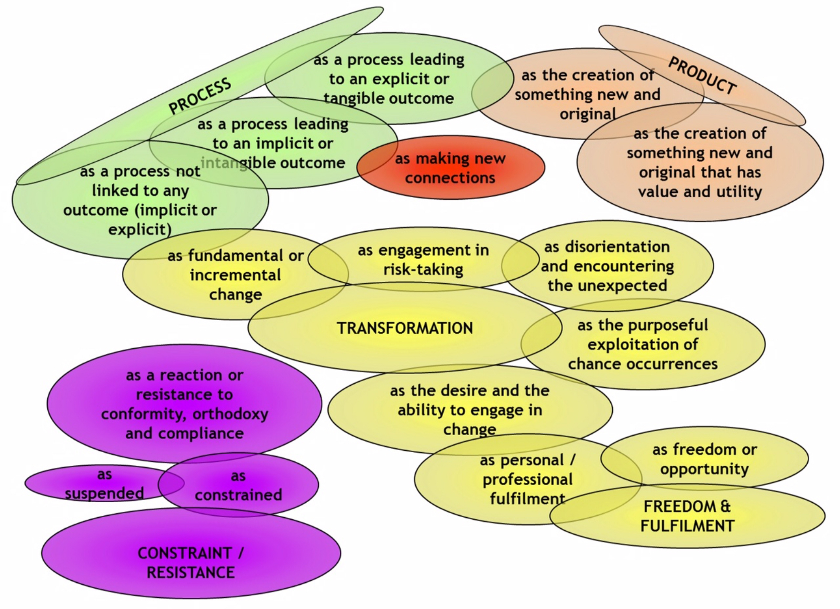 There were many such moments in all the interviews, and after personally transcribing all the interviews (extraordinarily tiring, but so valuable in being able to get ‘inside the source material’), I began to search for patterns of thoughts and behaviour. Slowly but surely, after a long and rigorous iterative process, the many and varied experiences of creativity in higher education began to coalesce around five main conceptual categories. I attempted to capture them in the following map: